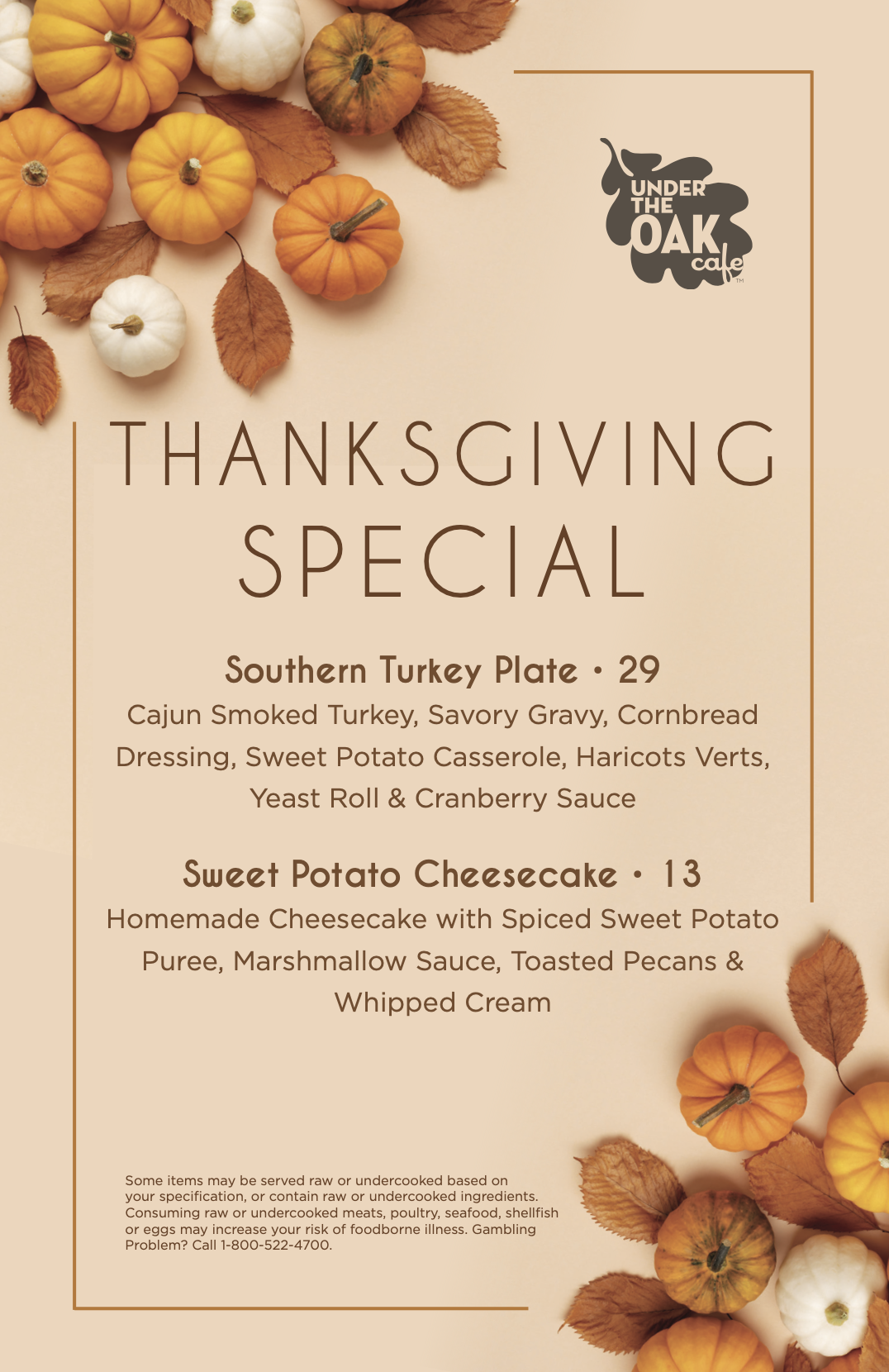 Dine under our relaxing oak tree with a wonderful menu selection for breakfast, lunch or dinner! Enjoy comfort food classics, traditional Southern entrees, and items for every taste! At Under the Oak Cafe, you’ll also experience the finest Southern hospitality on the MS Gulf Coast.